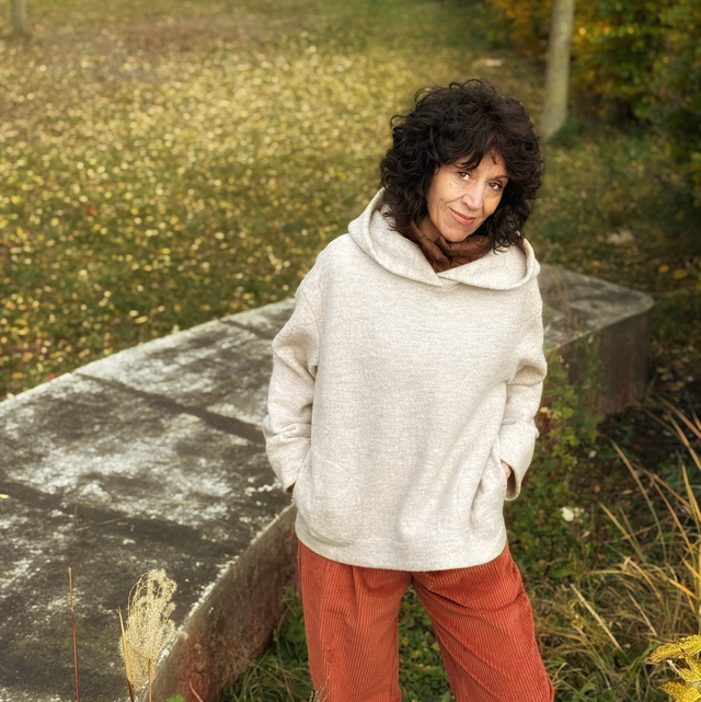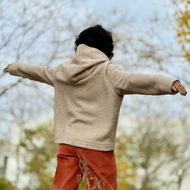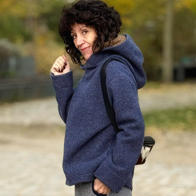 Der Pullover hat eine übergroße Kapuze um selbst bei Wind und Kälte den Hals, Kopf, Nacken wärmen.
