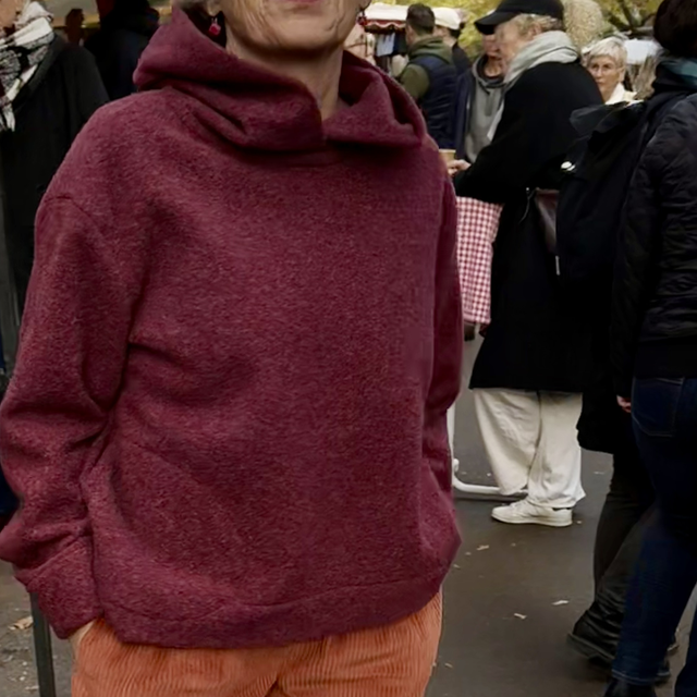 Der Pullover hat eine übergroße Kapuze um selbst bei Wind und Kälte auch den Hals, Nacken , Kopf zu wärmen.
